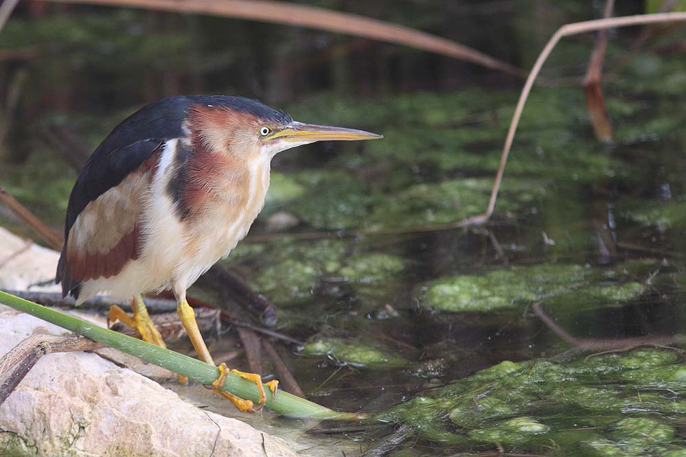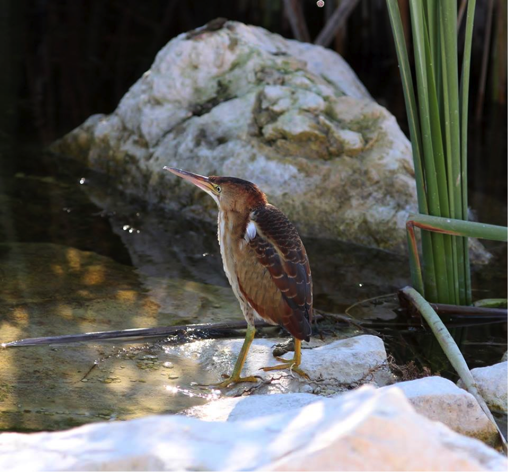 The Least Bittern is classified as a small heron of about 30 cm, just bigger than a robin. It breeds in marshes associated with emergent vegetation and needs some open, clean and clear water, as it hunts the marsh edges by sight. This bird is seldom seen but most often detected by call.