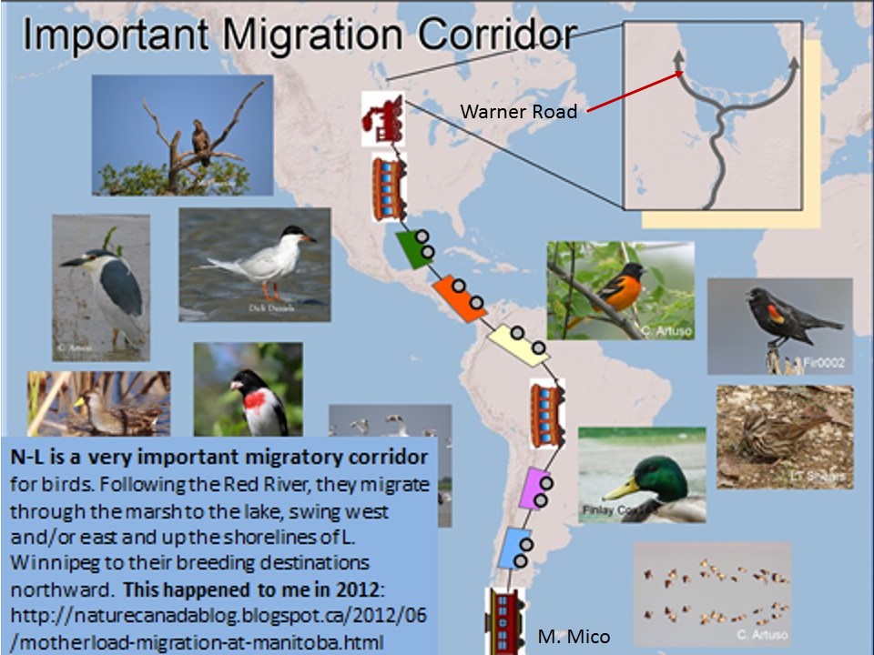 As I left for Warner Rd. (two miles from my house in Whytewold) this morning a flock of some 30 crying gulls were flying over. And when I got to Warner Rd., “Oh my! I guestimate 1000 scattered about on the ice as far as the binocs could see with another several thousand winging their way north as singles and small flocks averaging 10 – 50 at a time from 6:30 am – 7:30 am – all coming out of the Netley-Libau Marsh (MB IBA009) to the beach ridge separating the marsh from the lake, all following the lake’s shoreline north, all crying, a small contingent of Franklin Gulls being a part of this gull migration. T’was very worth hearing and seeing..