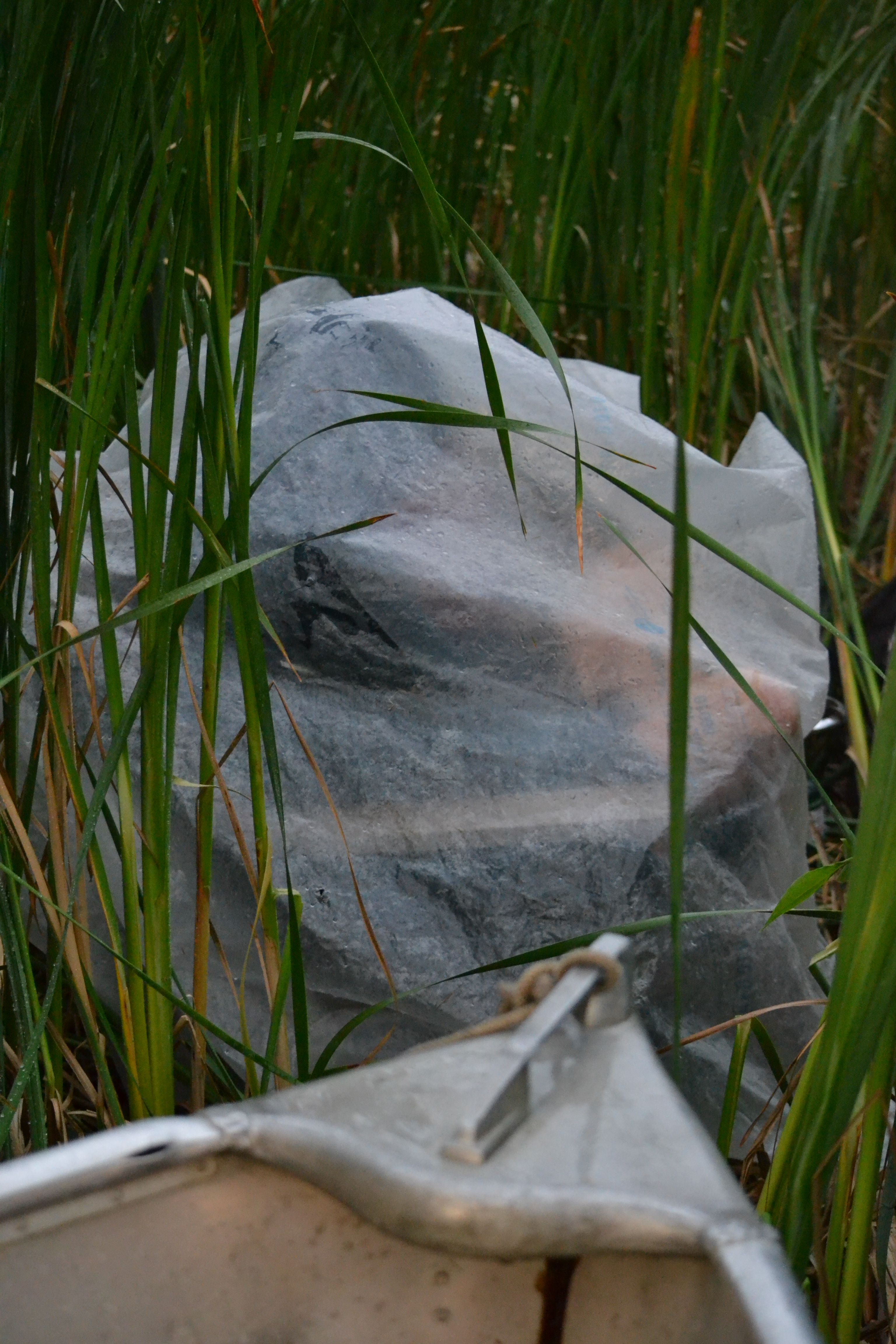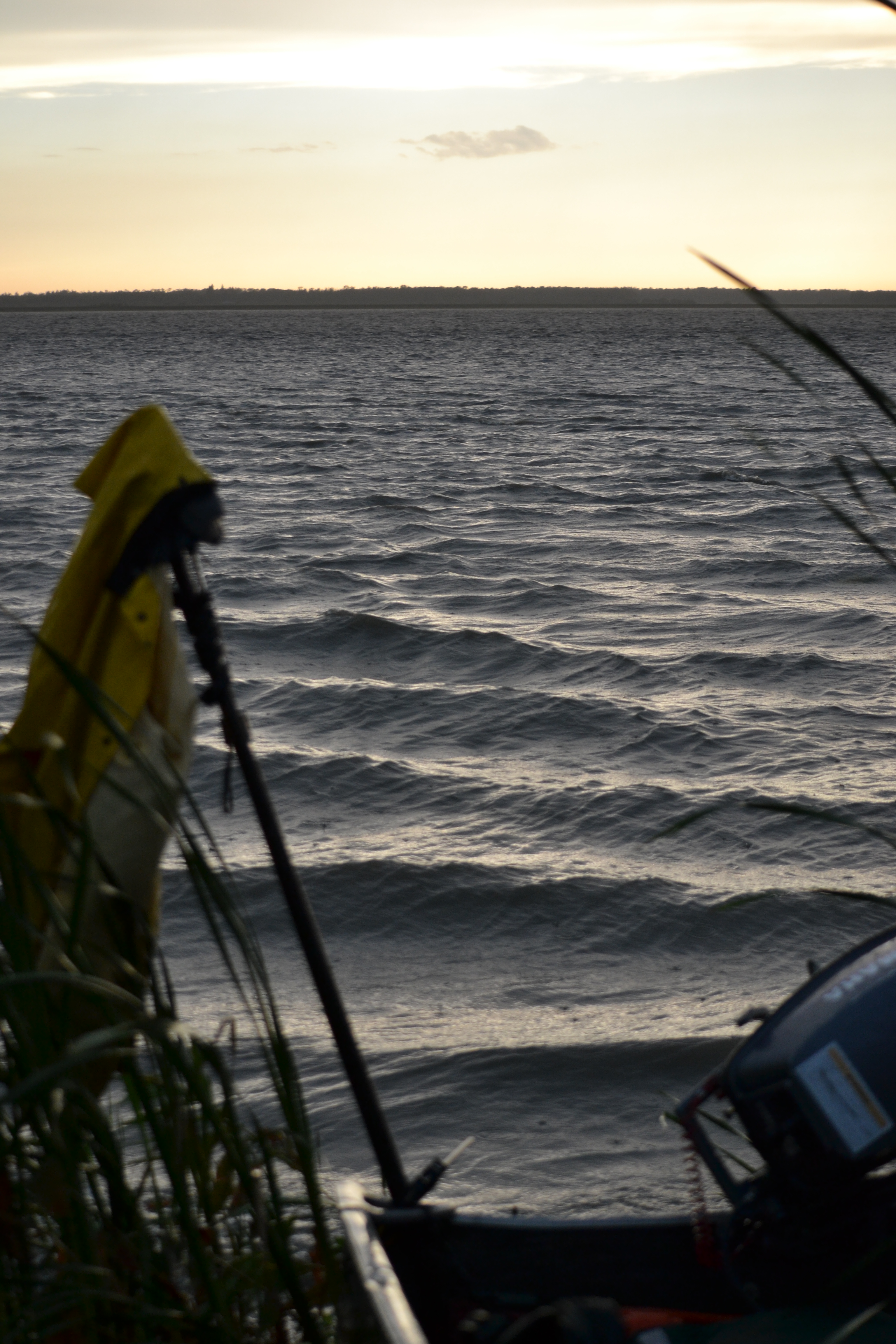 So we boot it south up the Hughes, west and north along the Passwa, and attempt to cross Hughes Lake (a small, shallow inner marsh lake) north west to the Sal. and the BIG STORM hit with a soaking, violent vengeance. We were no more than 100 ft. into Hughes Lake and, had we had arms of elastic, we could have stretched’em out and touched the banks of Sal. and pulled ourselves ashore – we were that close – about 1/2 km.! But we had to turn’er back. I sped the boat south up the Passwa about 100 yds. and rammed’er into a big, tall stand of cattails on the Passwa’s east bank.