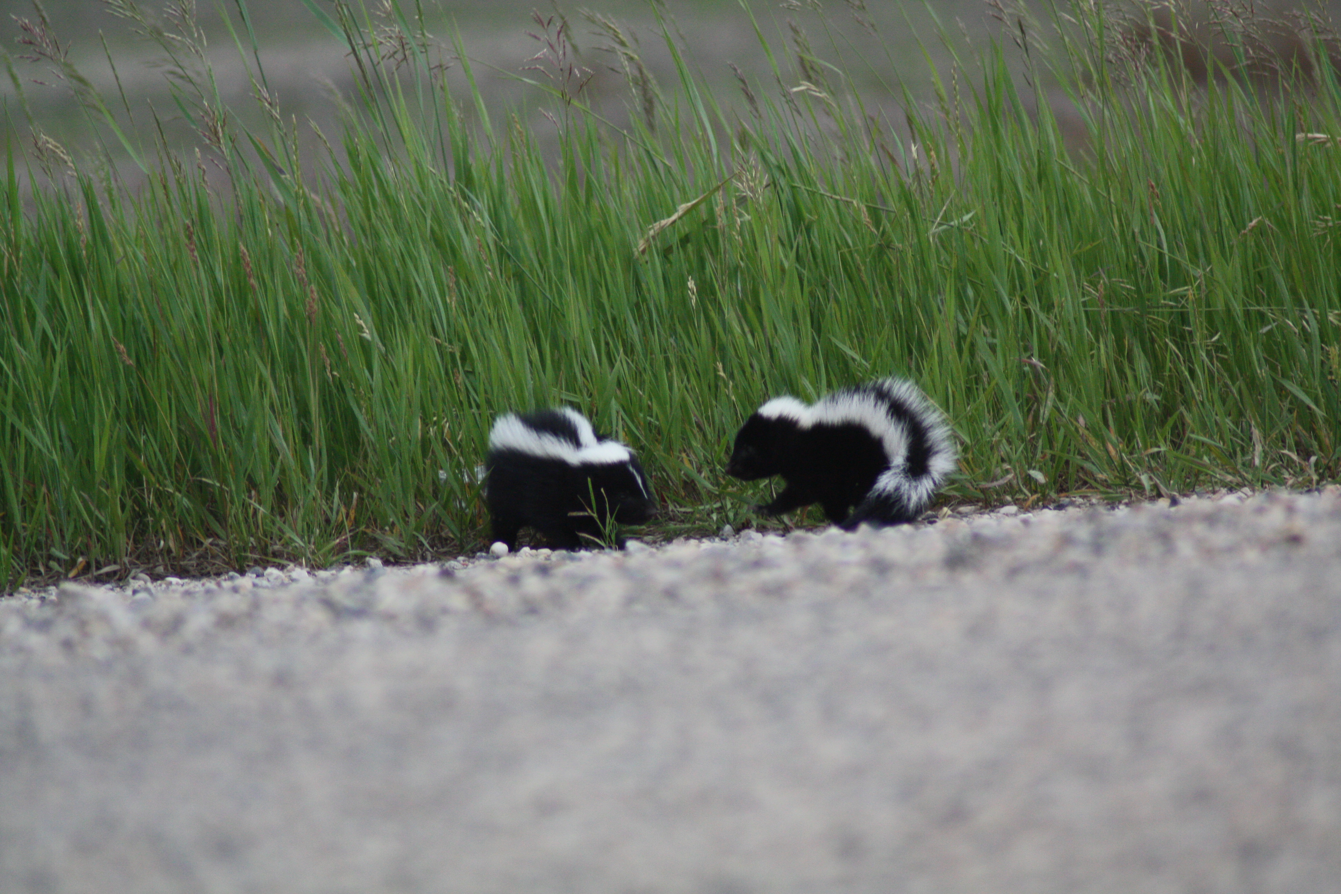 Just before entering the IBA itself things really picked up. Christian had been given the heads-up on 2 spots for Baird’s Sparrow just east of Pipestone. We stopped to listen and rather than the expected Baird’s Sparrow we were serenaded from on high by 2 Sprague’s Pipits, an endangered species for which our trip was partially geared towards. We also saw fleeting glimpses of a pair of Upland Sandpipers, a Grasshopper Sparrow, and a Clay-Coloured Sparrow. These, along with a variety of hawks, waterfowl, gulls, and songbirds, made for a good start to the trip, especially when capped off with a sighting of a pair of baby skunks.