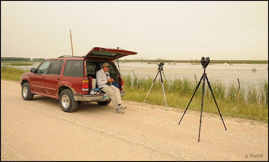 Driving along West Shoal Lake, the mist hovering over the water, a Belted Kingfisher flies across the front and as the organizer, I am getting a wee bit concerned. Soon Garry Budyk and John Weier will be here to start counting and I haven’t got a didgeridoo (clue) how things are going to go. Apparently it took about an hour after our 7am start for Garry and John to get going. But things did improve (as evidenced below).