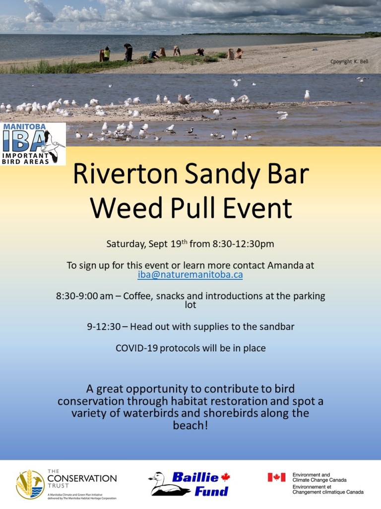 Shorebird Webinar – Nature Conservancy Canada (NCC) with Manitoba IBA: Hear about migration stories of shorebirds in Manitoba track with MOTUS Wildlife Tracking Technology, discover about citizen science opportunities with the International Shorebird Survey, and learn tips and techniques for counting shorebirds. September 22, more details to come.