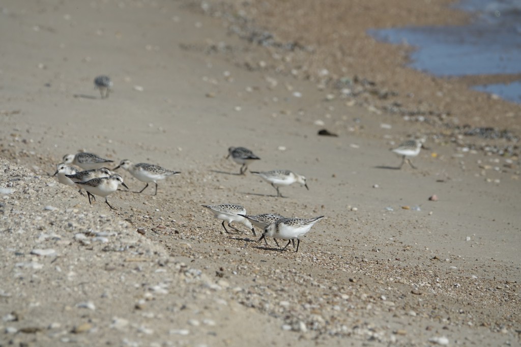 Around noon the team took a well-deserved break and hiked down the spit in search of shorebirds. We saw a variety of shorebirds, waterfowl, and a few other migrants. Yellow-rumped Warblers have clearly started their migration down south, as they were one of the most abundant species recorded for the day (second to over 600 Canada Geese spotted). Some other highlights were a Ross’s Goose and a Greater White-fronted Goose. We were also lucky enough to have about 15 Sanderlings come very close to our group. They were clearly distracted by all the good grub.