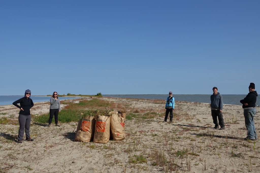 Par la suite, nous avons marché les quelques 1,5 km qui nous séparaient de notre destination. Même avec l’automne déjà bien avancé, les plantes invasives semblaient tout aussi vertes et en santé que d’habitude. Le groupe s’est attaqué aux zones qui seraient les plus favorables pour la nidification des limicoles. Les plants de trèfles, de bardanes et de potentilles étaient très abondants à notre arrivée (mais elles ne l’étaient plus à notre départ!). Ce n’est pas à tous les jours que la restauration d’habitat passe par le désherbage d’une région, mais en arrachant ces plantes invasives, nous espérons recréer les plages sablonneuses tant désirées par certaines espèces de limicoles et de sternes. Le pluvier siffleur, par exemple, est une espèce en péril qui nichait historiquement dans cette ZICO. Malgré le fait que cette espèce n’aie pas été vue à Sandy Bar depuis 2004, elle a niché dans un endroit tenu secret au Manitoba en 2016. Nos efforts continus contribueront peut-être à son retour.