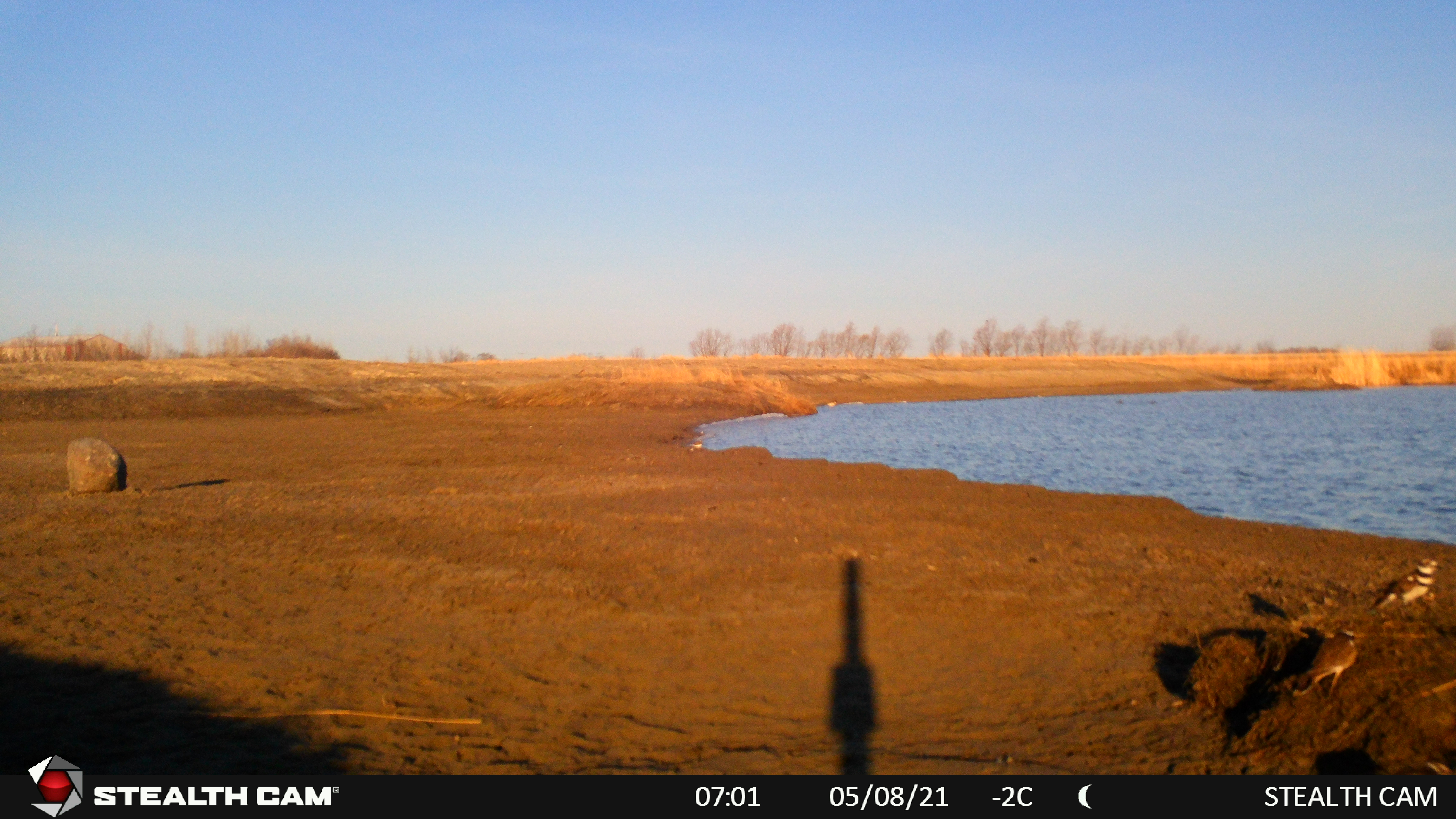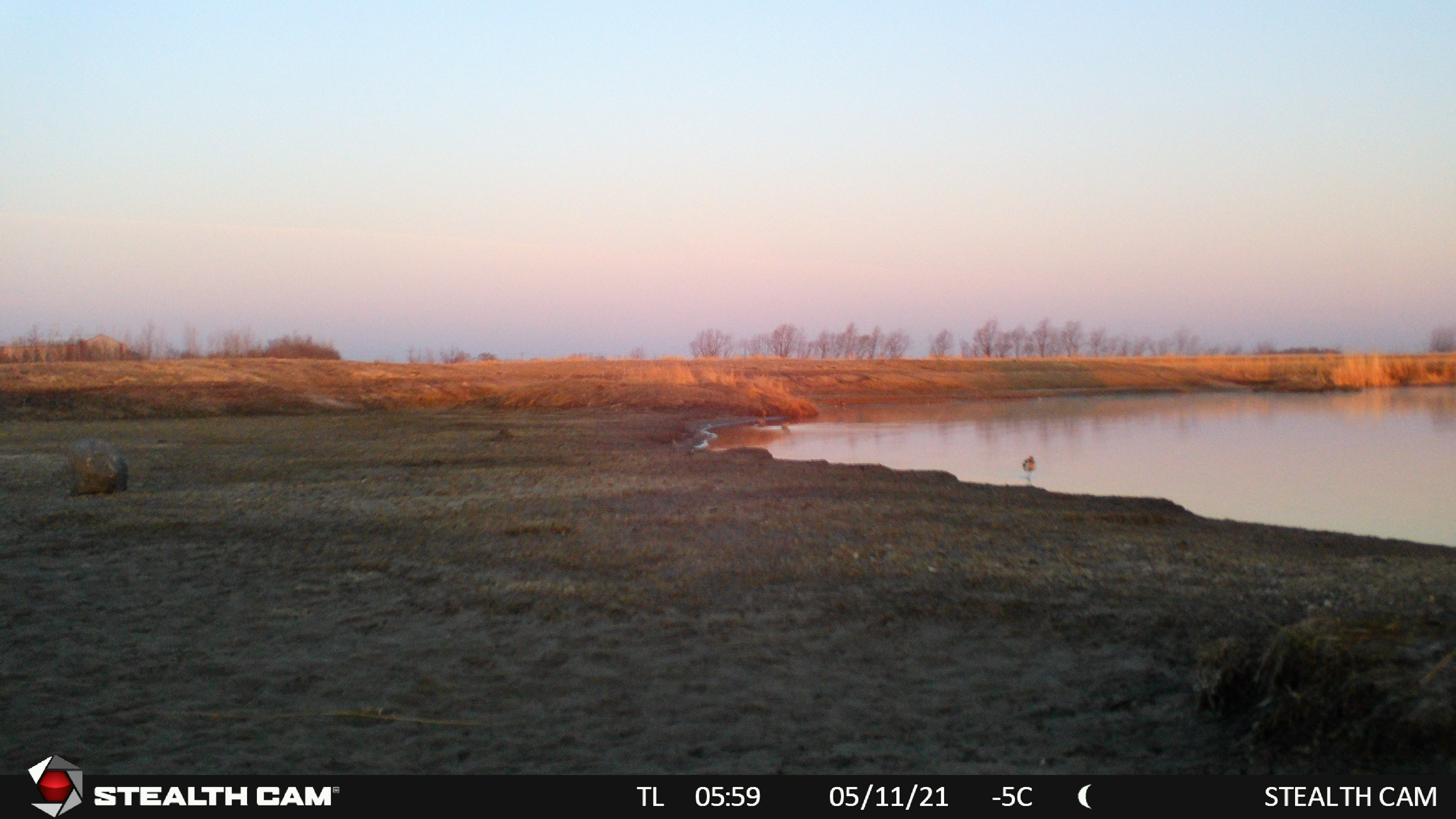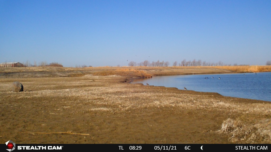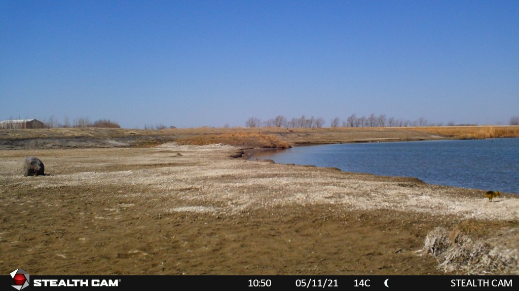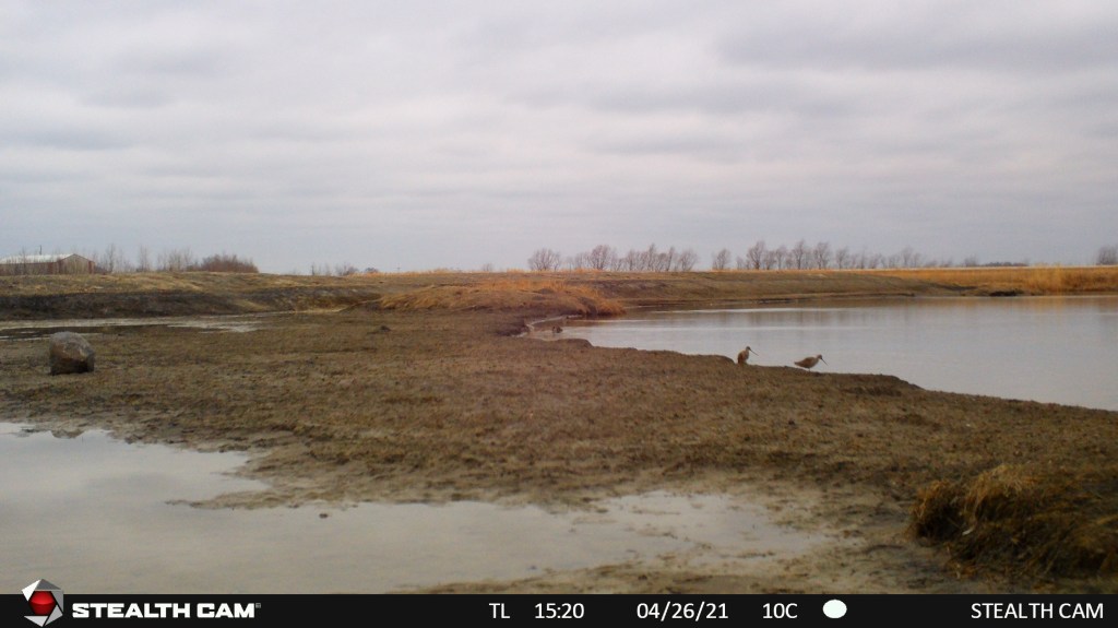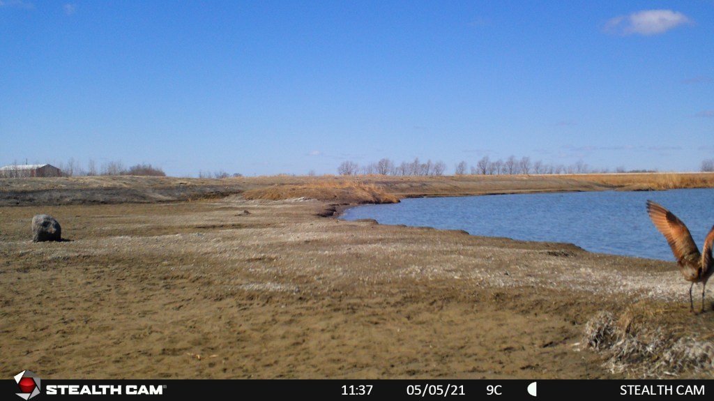 This spring the Manitoba IBA program at staff at the Harry J. Enns Wetland Discovery Centre put out a trail camera at the Oak Hammock Marsh shorebird scrape. The scrape was constructed last year to create additional habitat for shorebirds in the marsh. It is the first time (to our knowledge) that a scrape has been constructed in Manitoba for shorebird habitat. A scrape is a shallow depression made in the ground of wet habitat (in our case attached to a pond) that is seasonally filled with water. The scrape slowly dries out and provides the shallow water and shoreline habitat favoured by shorebirds and many other bird species as well. As this is very much a trial, we wanted to have a set of “eyes” out on the scrape often – so we added a trail camera!