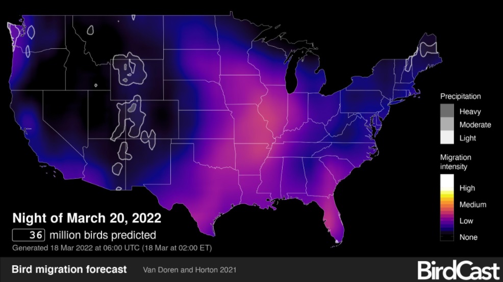 BirdCast is a website that uses weather surveillance radar to create bird migration forecast maps, real-time migration maps and local bird migration alerts. Unfortunately, the maps only extend to the Canada-US border, but as concentrations of birds move through the United States on spring migration, we can use the maps to predict when they might arrive in Manitoba. There are many studies that show strong ties between weather and migration rates. Additionally, large numbers of birds actually show up on Doppler radar themselves!