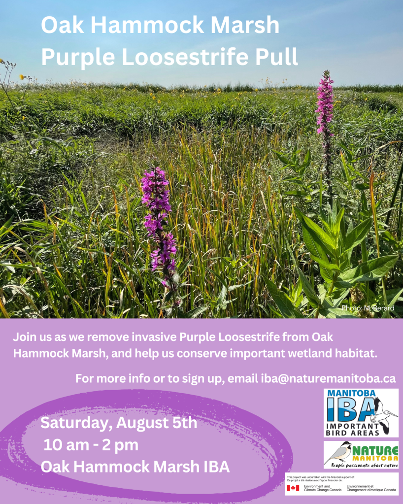The Manitoba IBA program is looking for volunteers for our upcoming events, including a purple loosestrife pull at Oak Hammock Marsh, a weed pull at Riverton Sandy Bar, and a bird blitz at Whitewater Lake. Keep reading for more details. The more the merrier!