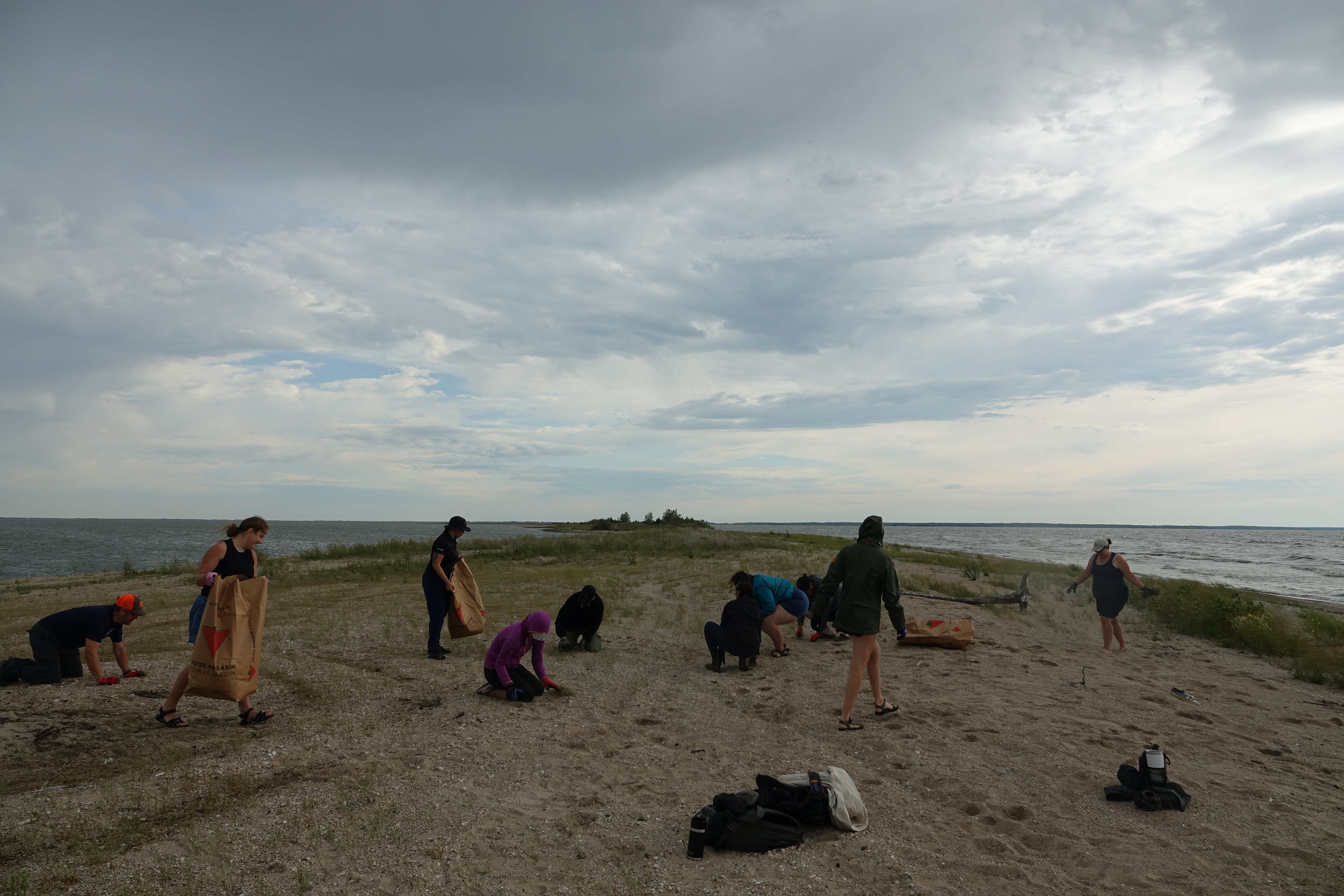 14 volunteers braved the wind and the drizzling rain to help us remove weeds from the beach, and by the end of the day, the crew had filled 9 yard waste bags! Incredible work!
