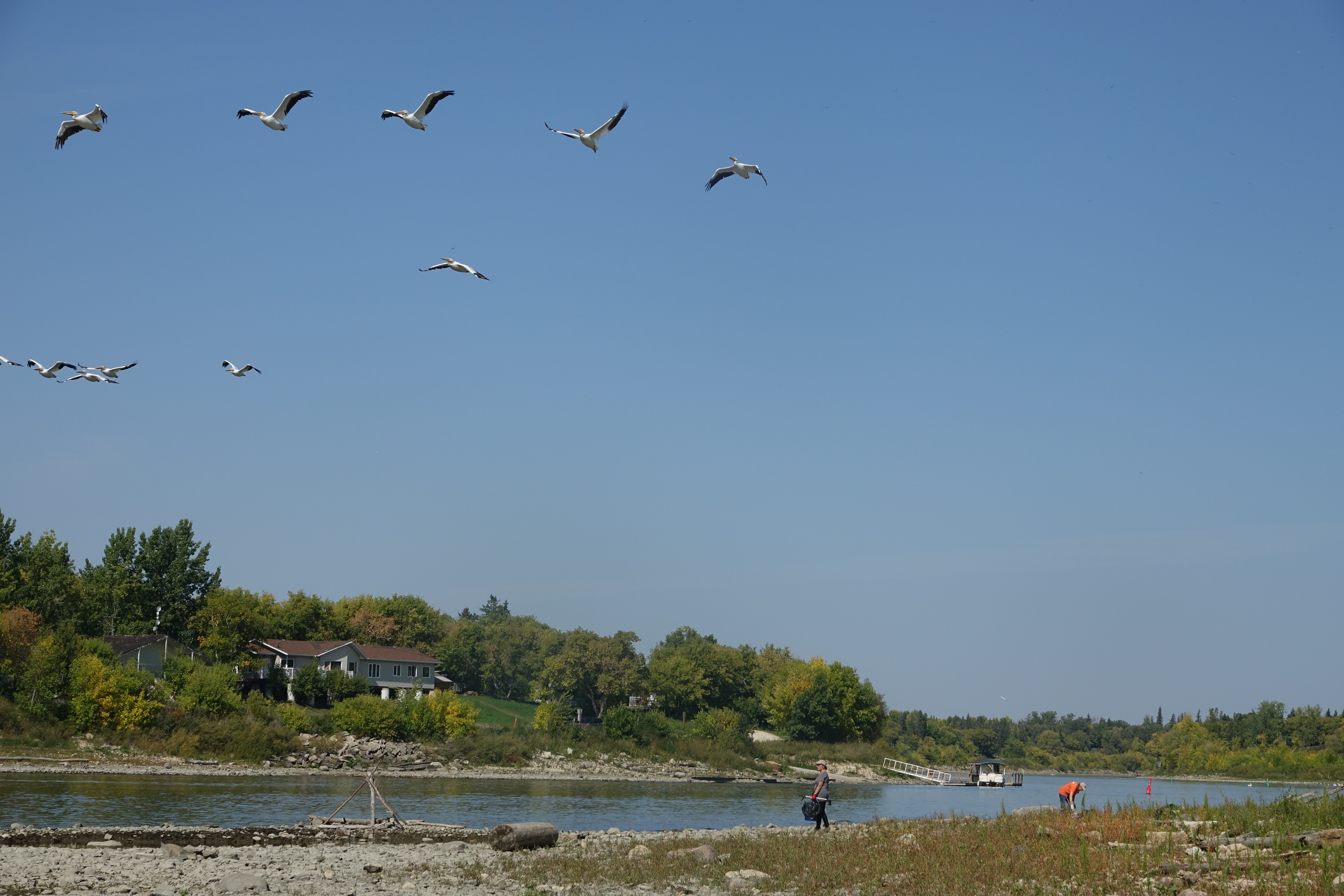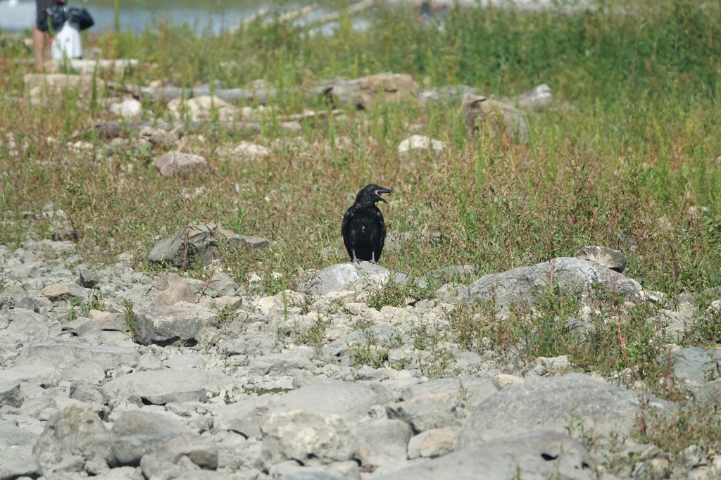 The low water levels in the river allowed volunteers to venture out onto the exposed rocks, where they had some close encounters with foraging shorebirds. Groups of American White Pelicans flew overhead, and a Common Raven came to see what all the action was. Thank you to our incredible team who braved the heat to help improve this section of shoreline habitat along the Red River.
