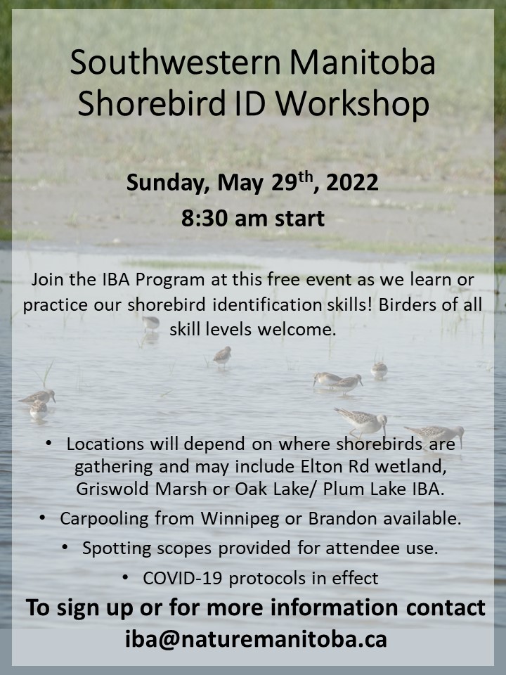 Join us Saturday, May 25 @ 9 am for a shorebird identification workshop, in southwestern MB. As shorebirds migrate through, it can be hard to predict when and where they will be found in good numbers. We will determine the exact location closer to the date, but we hope to hold this event within 30 minutes of Brandon. To register, email iba@naturemanitoba.ca.