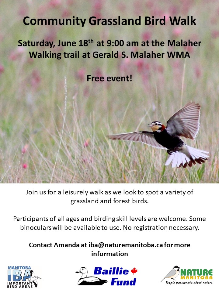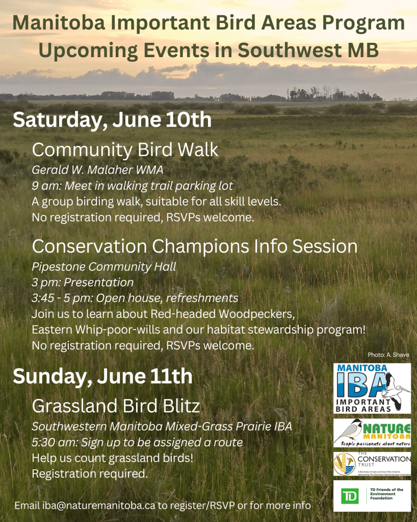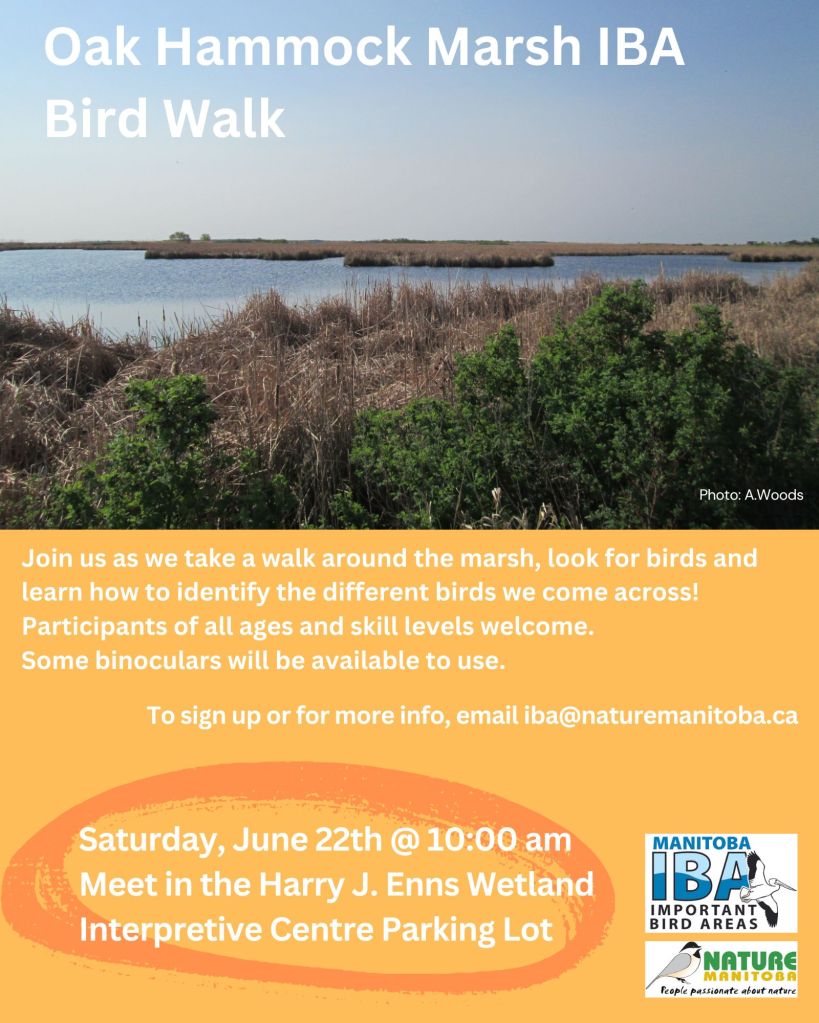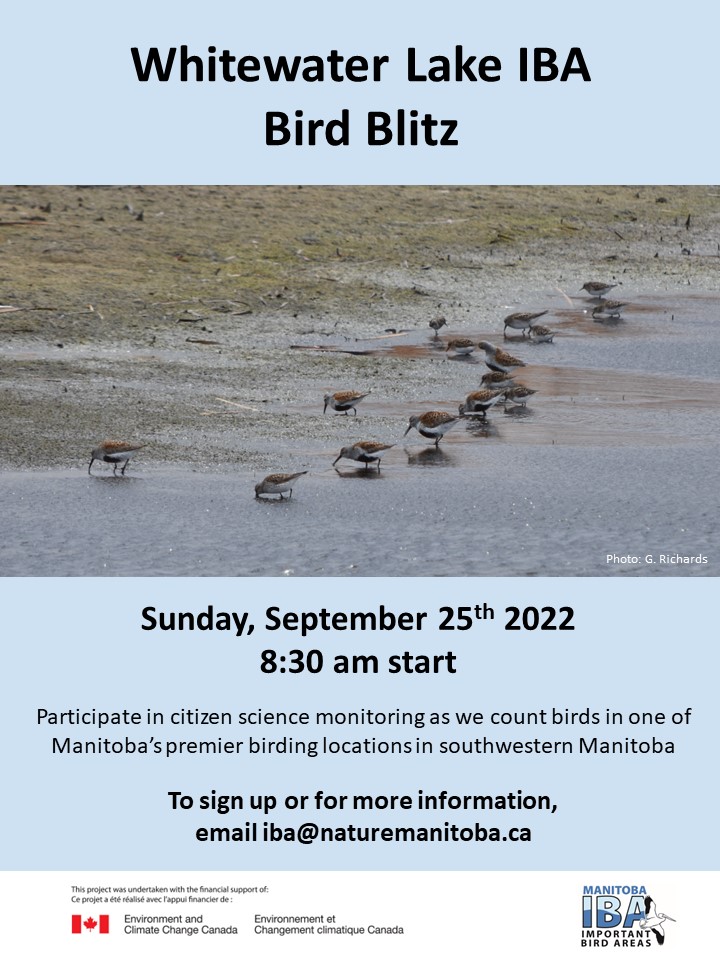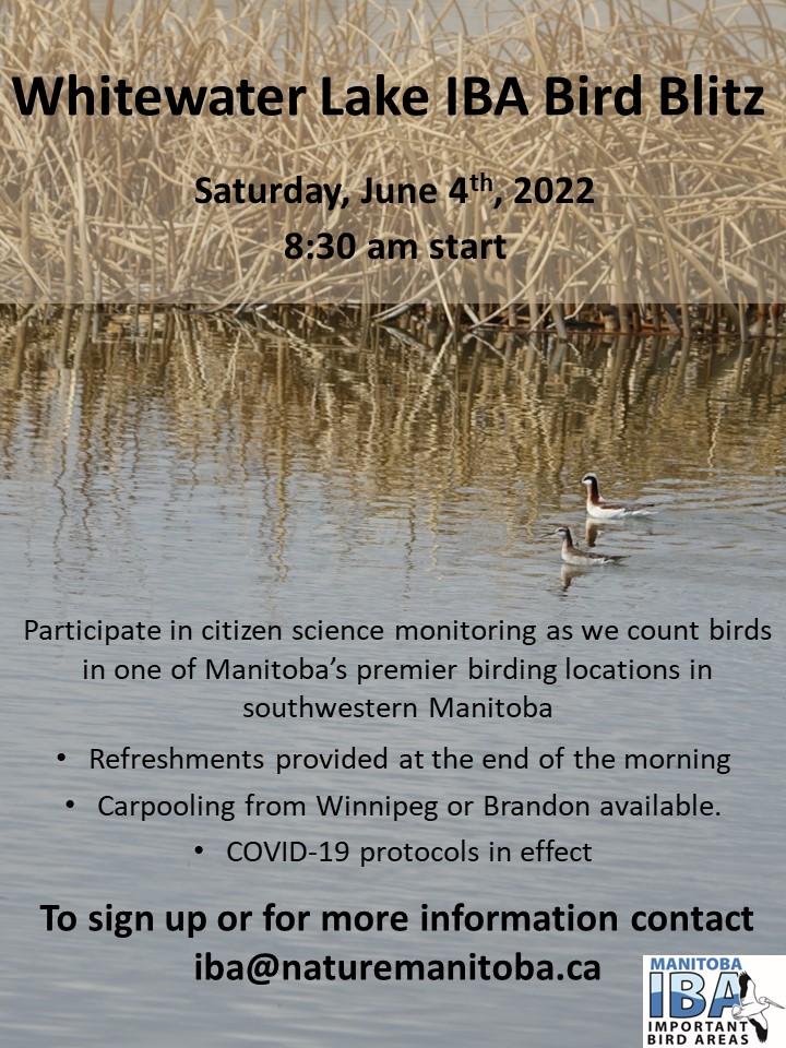 Join us for a Bird Blitz at Whitewater Lake IBA, starting at 8:30 am. Carpooling from Brandon or Winnipeg may be available. Email Marissa at iba@naturemanitoba.ca to sign up.