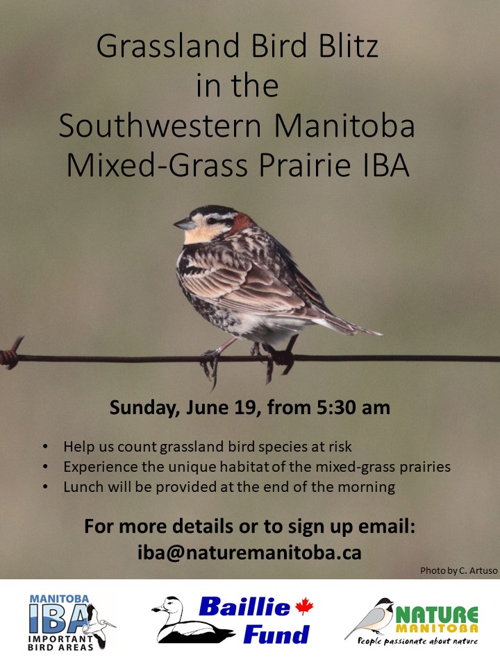 Join us on Sunday, June 9 as we visit the Southwestern Manitoba Mixed-Grass Prairie IBA and search of grassland birds. We hope to find bird species at risk such as the Chestnut-collared Longspur, Sprague’s Pipit, Ferruginous Hawk, Loggerhead Shrike and more! We will begin the blitz at 5:30 am. Email Marissa at iba@naturemanitoba.ca for more information or to sign up.
