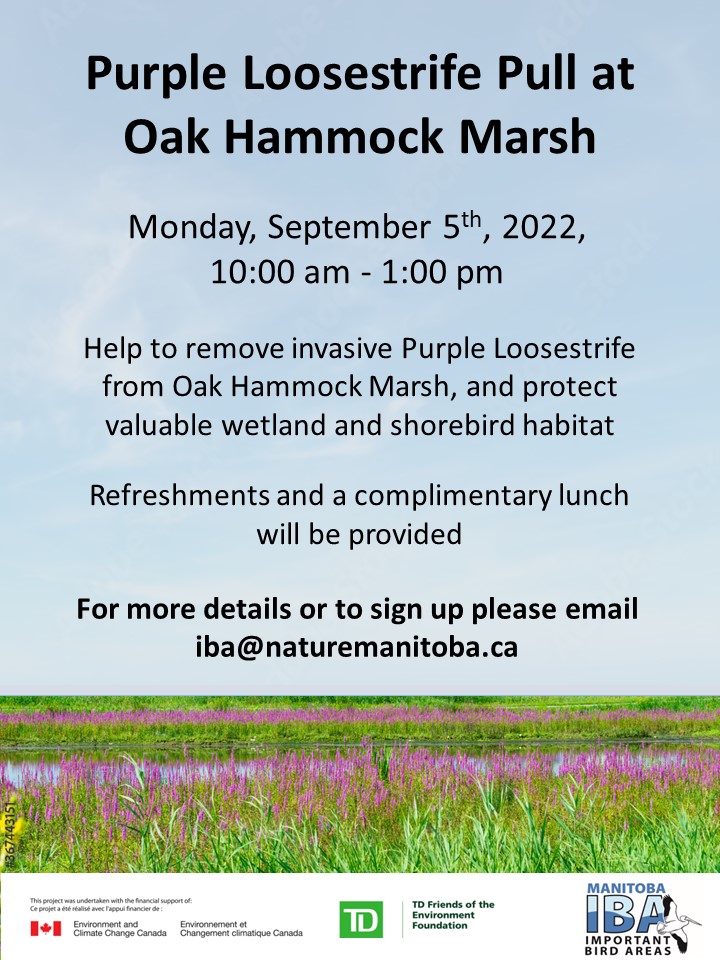 We are looking for volunteers to help us protect valuable bird habitat, and remove invasive purple loosestrife from Oak Hammock Marsh IBA, from 10 am to 2 pm. Snacks and refreshments will be provided. Carpooling may be arranged, when possible. Email Marissa at iba@naturemanitoba.ca to sign up.