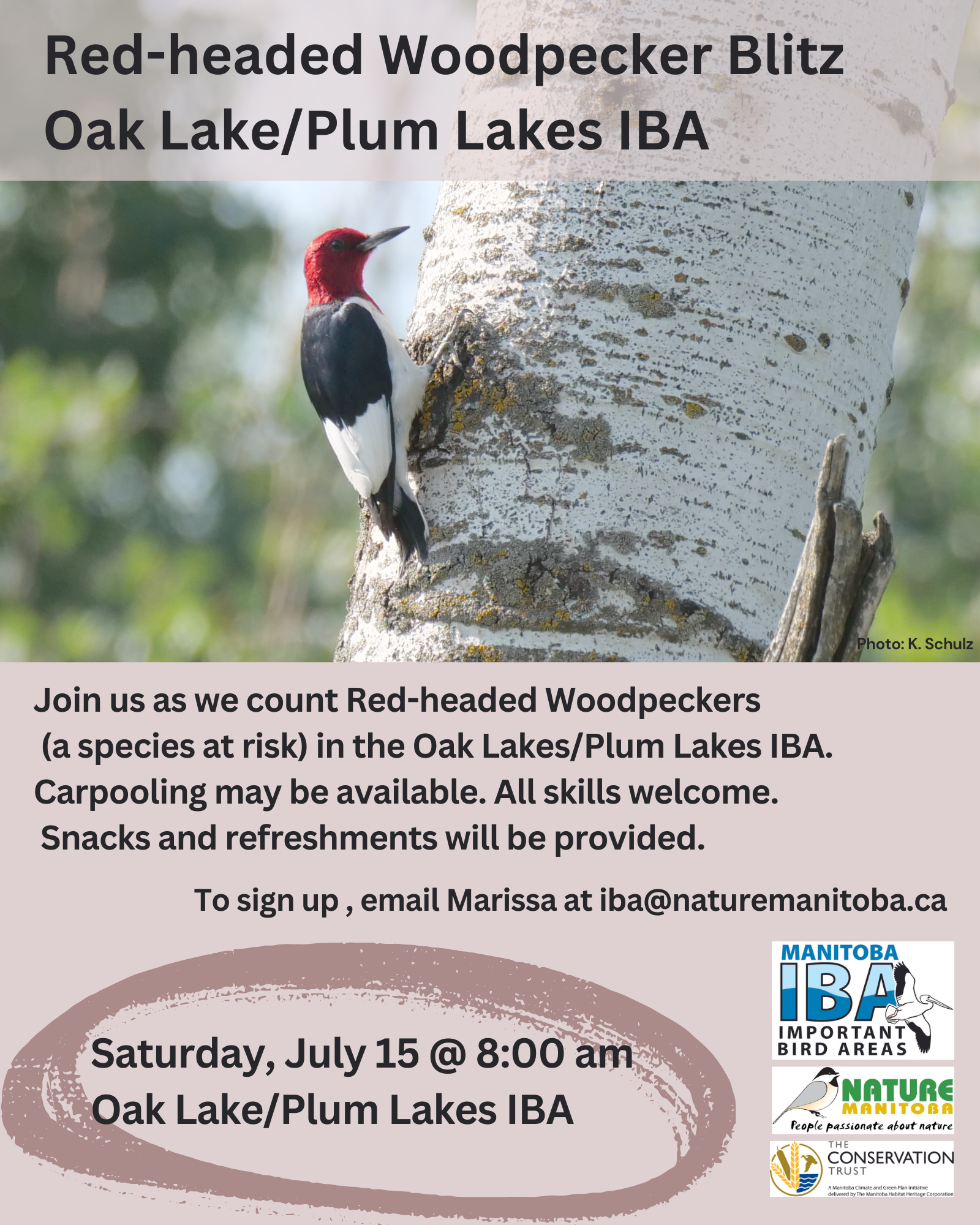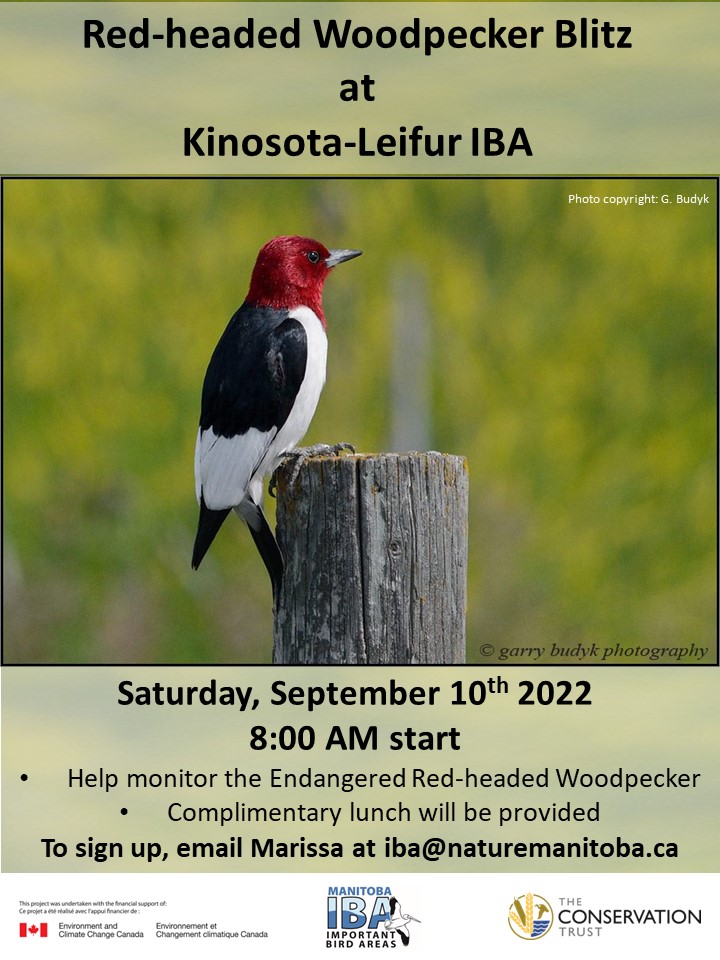 We are looking for volunteers to help us count the Red-headed Woodpecker in Oak Lake/Plum Lakes IBA, on Saturday July 6. The blitz will begin at 8:30 am. Carpooling can be arranged, when possible. All skill levels welcome. Email Marissa at iba@naturemanitoba.ca to sign up.