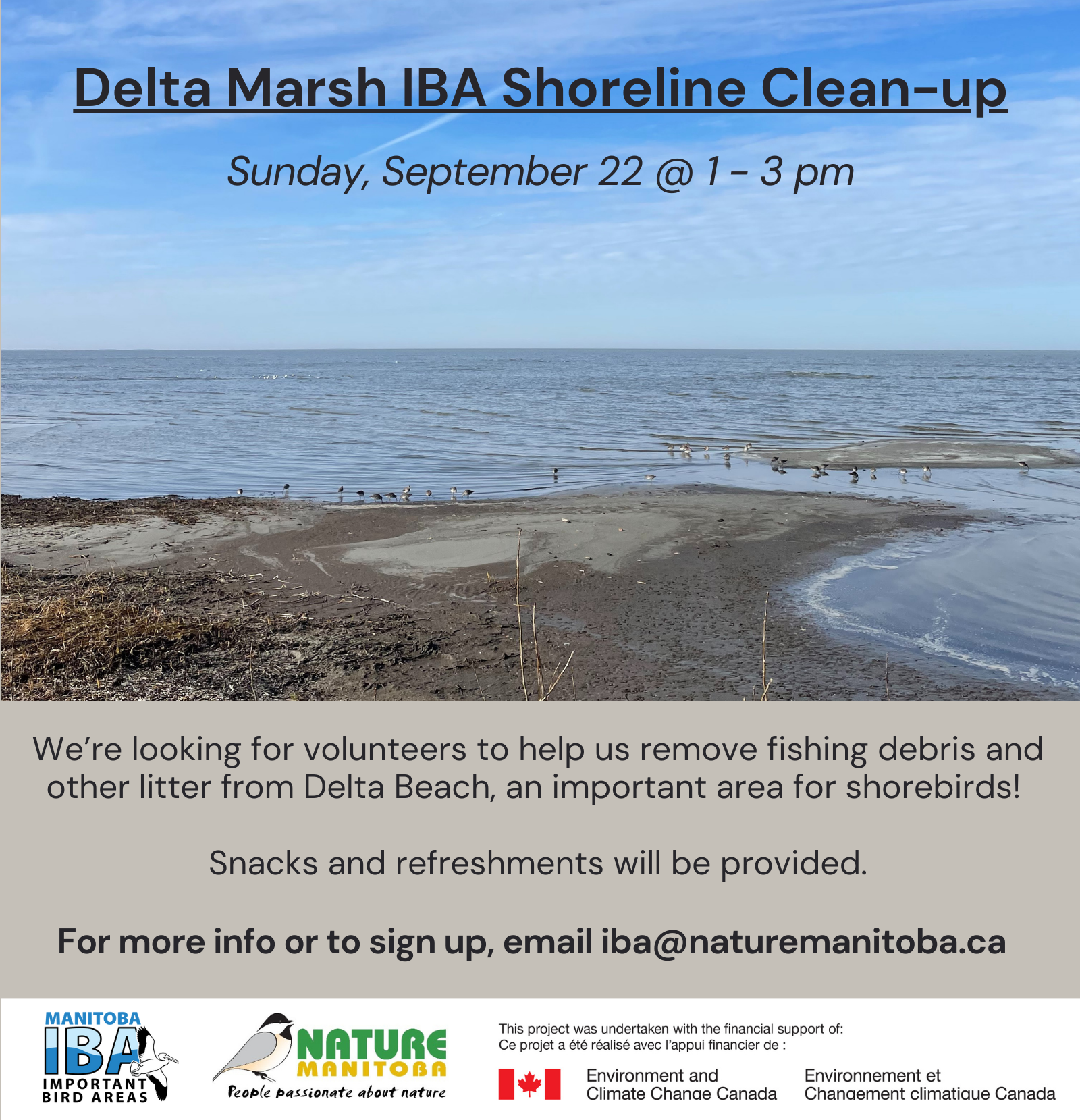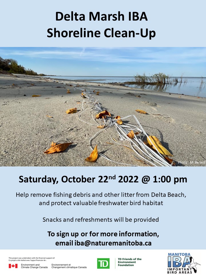 We’re looking for volunteers to help us remove fishing debris and other litter from Delta Beach, on Sunday, September 22 from 1- 3 pm. Delta Beach provides important stop-over habitat for migrating shorebirds, as well as other bird and wildlife species! Snacks and refreshments will be provided. Email Marissa at iba@naturemanitoba.ca for more info and to sign up.