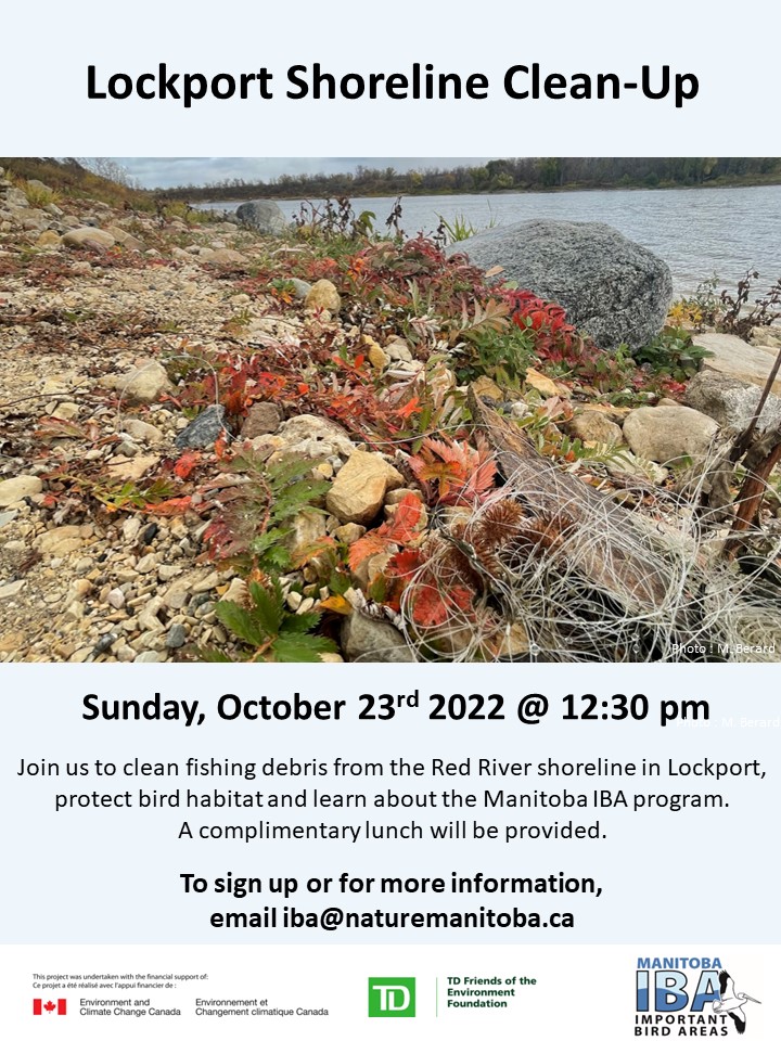 We’re looking for volunteers to help us remove fishing debris and other litter from the Red River shoreline in Lockport on Wednesday, October 16 from 1- 3 pm. Snacks and refreshments will be provided. Email Marissa at iba@naturemanitoba.ca for more info or to sign up.