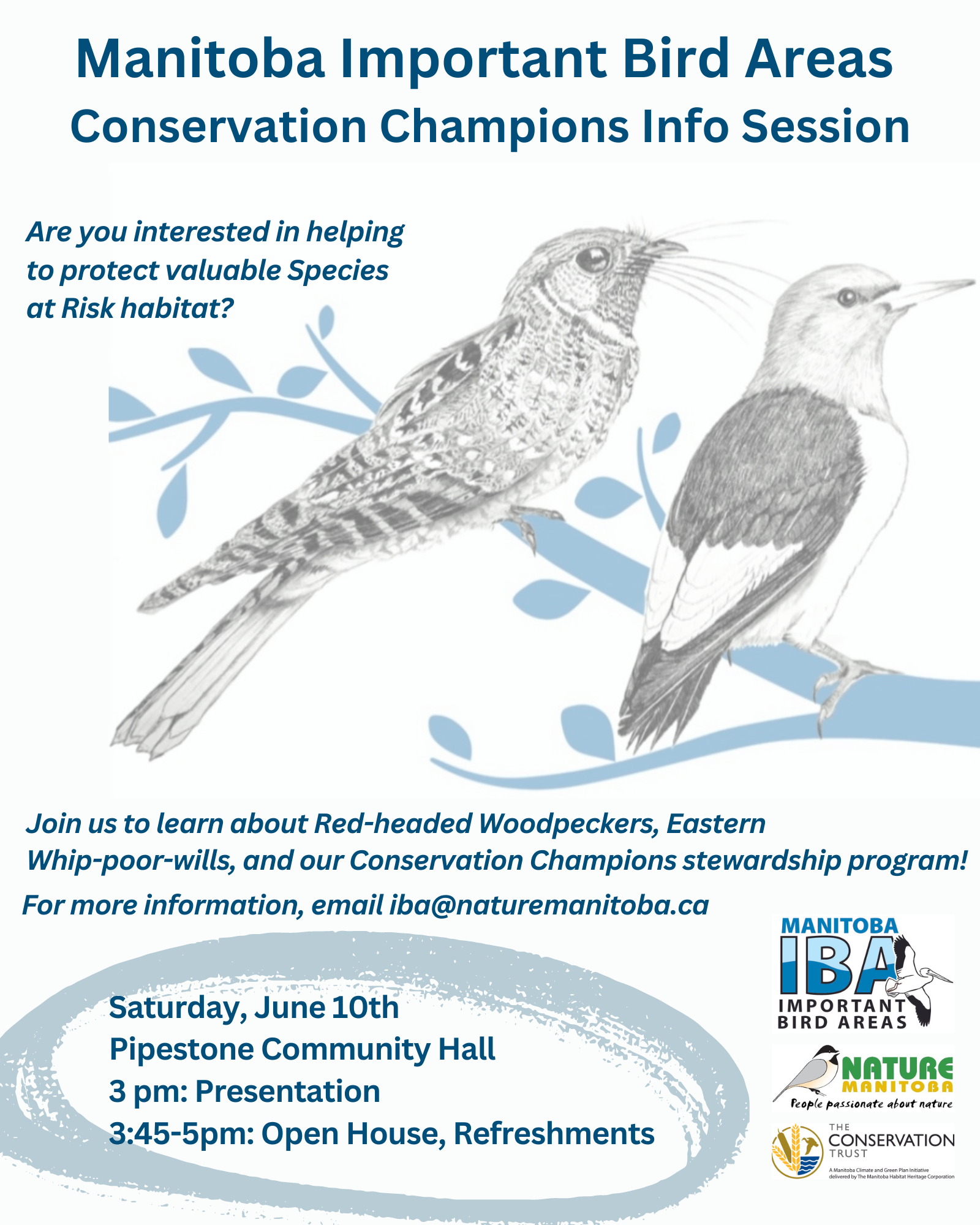 The Manitoba IBA program will be visiting the Pipestone Community Hall to connect with landowners and raise awareness about Red-headed Woodpeckers, Eastern Whip-poor-wills and our Conservation Champions program. There will be a presentation at 3 pm, followed by an open house from 3:45 pm – 5 pm during which folks can drop in and meet our staff, learn about our program, and enjoy some refreshments.