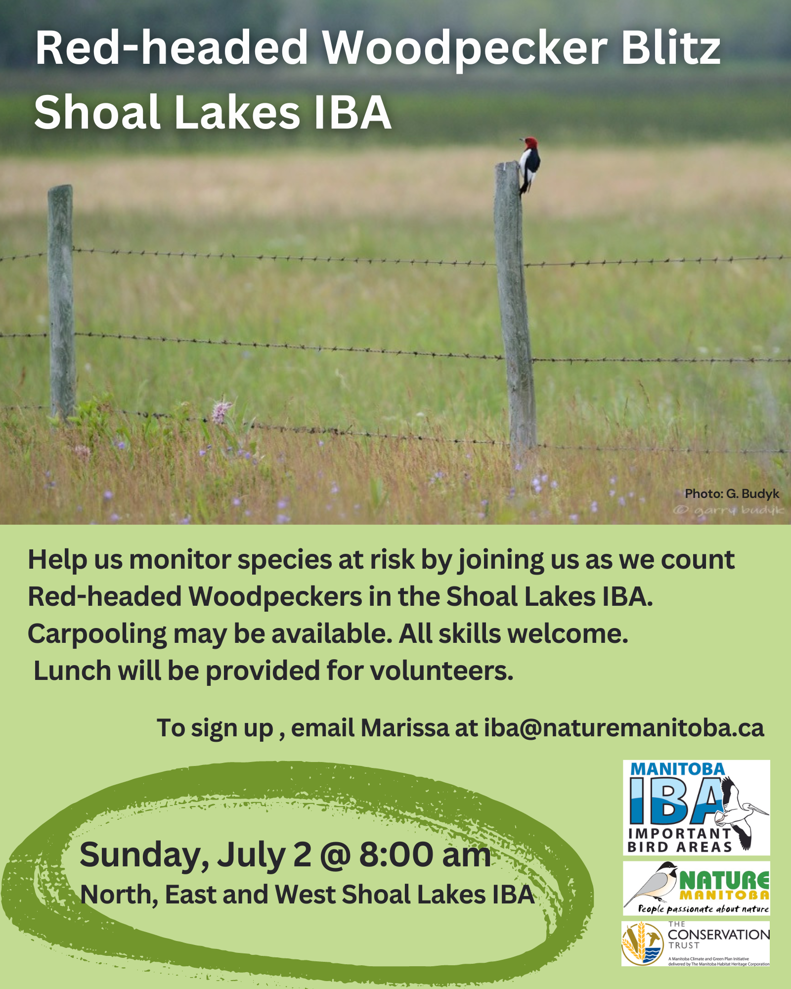 We are looking for volunteers to help us count the Endangered Red-headed Woodpecker in North, East and West Shoal Lakes IBA, starting at 8 am on Sunday, July 2. Carpooling can be arranged, when possible. All skill levels welcome! Lunch will be provided for volunteers. Email Marissa at iba@naturemanitoba.ca to sign up.