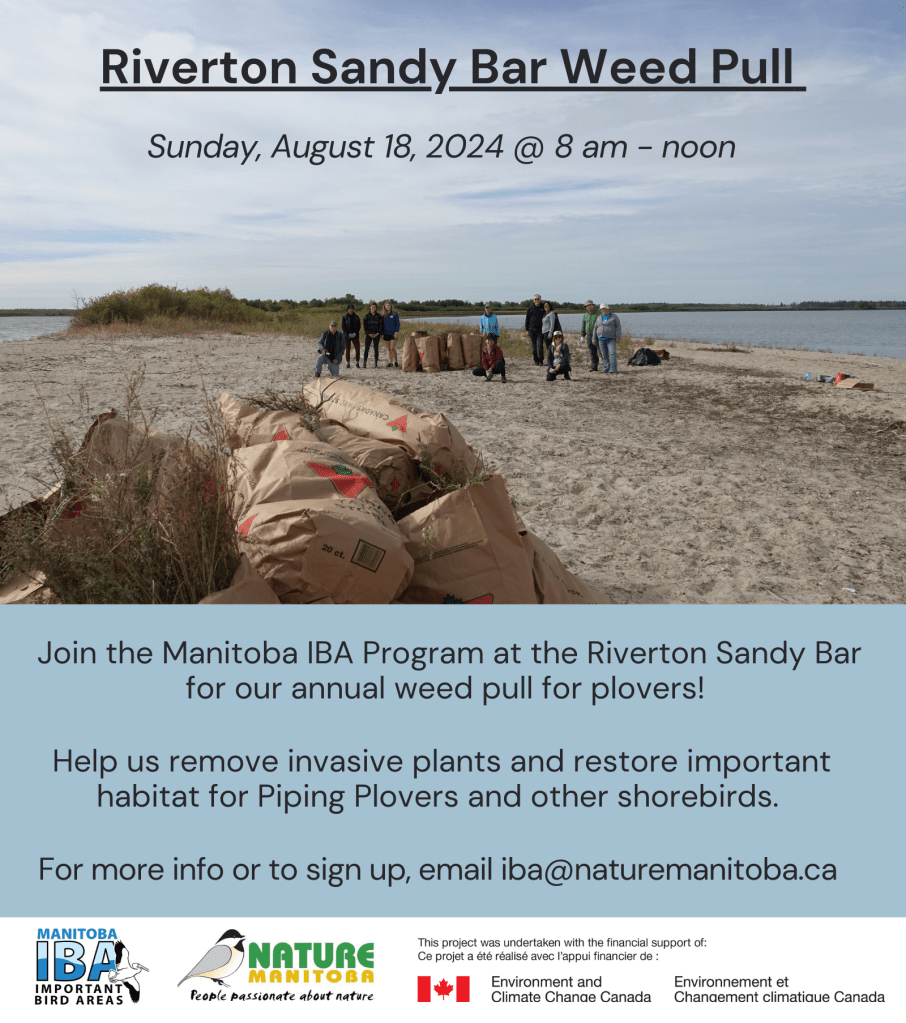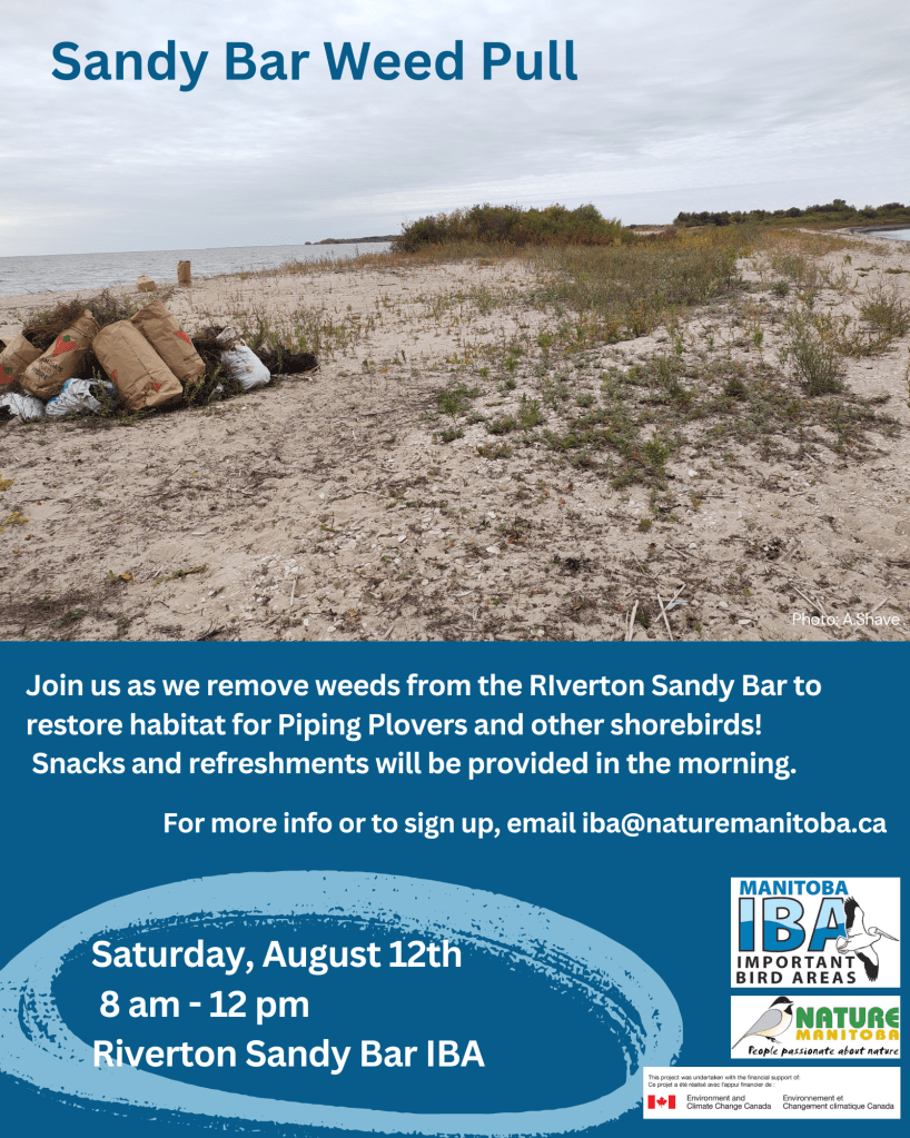 We are looking for volunteers to help us restore Piping Plover habitat and remove invasive plants from the Riverton Sandy Bar, on August 18 from 8 am to 12 pm. Snacks and refreshments will be provided. Email Marissa at iba@naturemanitoba.ca for more info and to sign up.