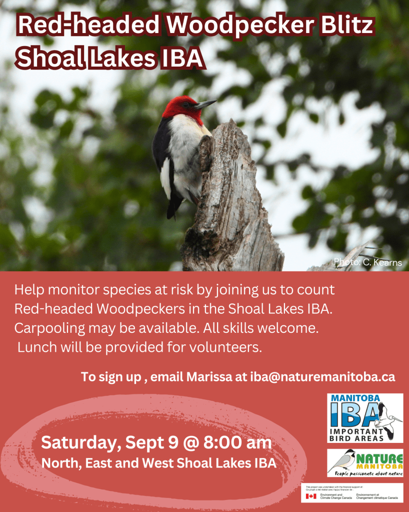 We are looking for volunteers to help us count the Endangered Red-headed Woodpecker in North, East and West Shoal Lakes IBA, starting at 8 am on Saturday, September 9th. Carpooling can be arranged, when possible. All skill levels welcome! Lunch will be provided for volunteers. Email Marissa at iba@naturemanitoba.ca to sign up.