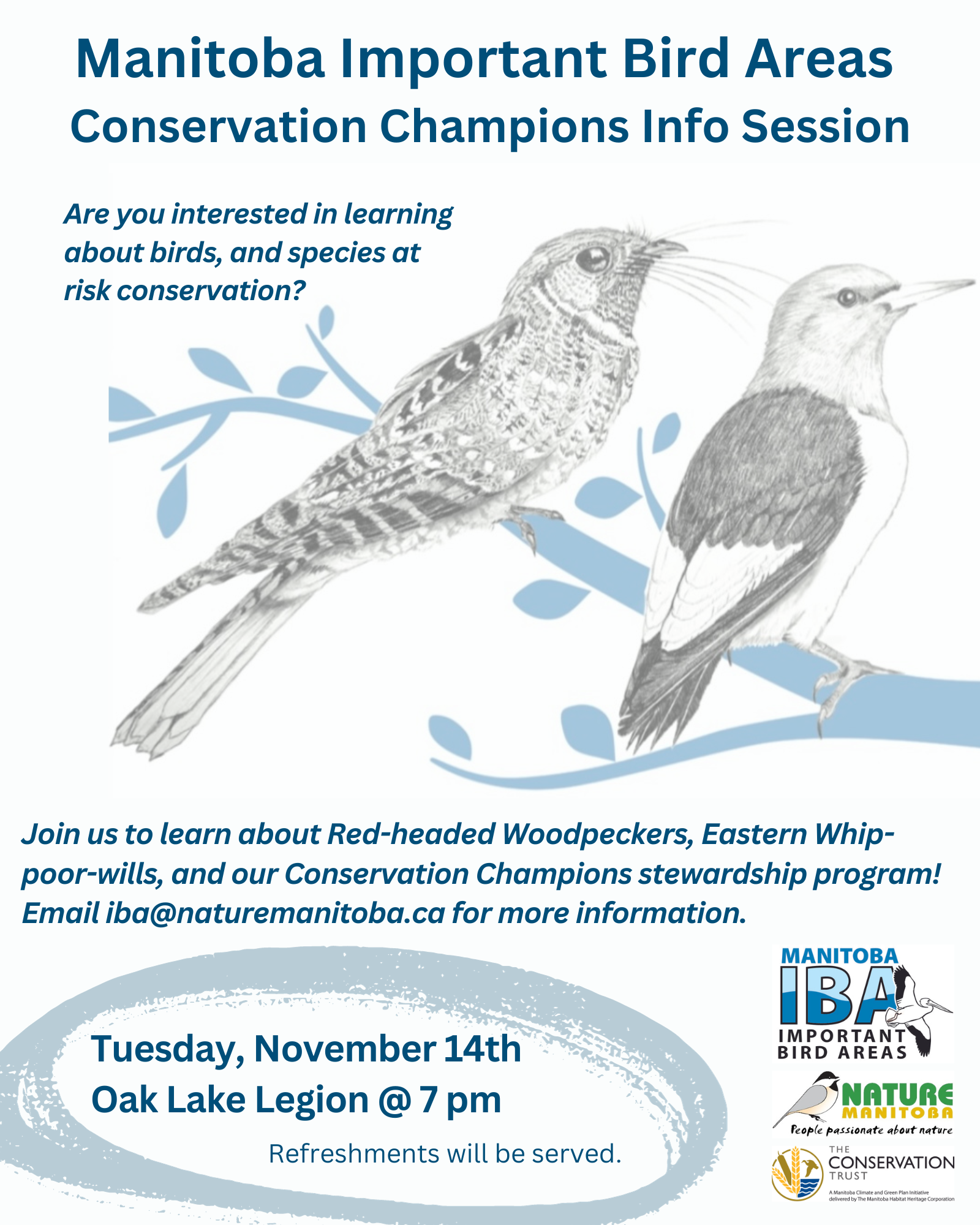 The Manitoba IBA program will be visiting different communities in the Interlake and Southwest Manitoba to connect with landowners in these areas and raise awareness about Red-headed Woodpeckers, Eastern Whip-poor-wills and our Conservation Champions program. The open house drop-in style portion of the event will go from 6-7 pm, followed by a presentation at 7:00pm. There will be coffee, tea and cookies!
