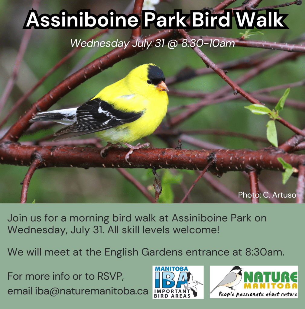 Join us for a morning bird walk at Assiniboine Park on Wednesday, July 31. We will meet at the English Gardens entrance at 8:30am and will go until about 10am (weather dependent). Please bring water and dress for the weather. There are washrooms by the Duck Pond which is near the meeting spot.
