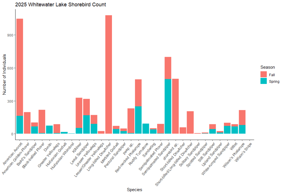 The final count of the 2025 Shoal Lakes Red-headed Woodpecker Blitz came to 40 RHWO, as I said above, a new potential program record! In total, our excellent group of birders observed 1753 individuals of 102 different species. A table summarizing all the observations is included below. Thank you again to our volunteers for an incredible event! This event was made possible by funding from Environment and Climate Change Canada’s Habitat Stewardship Fund.