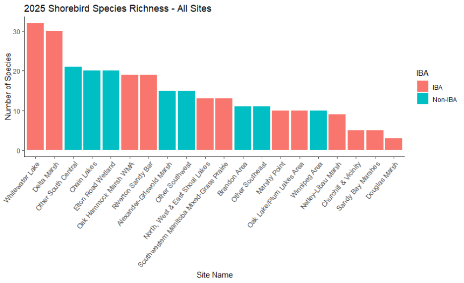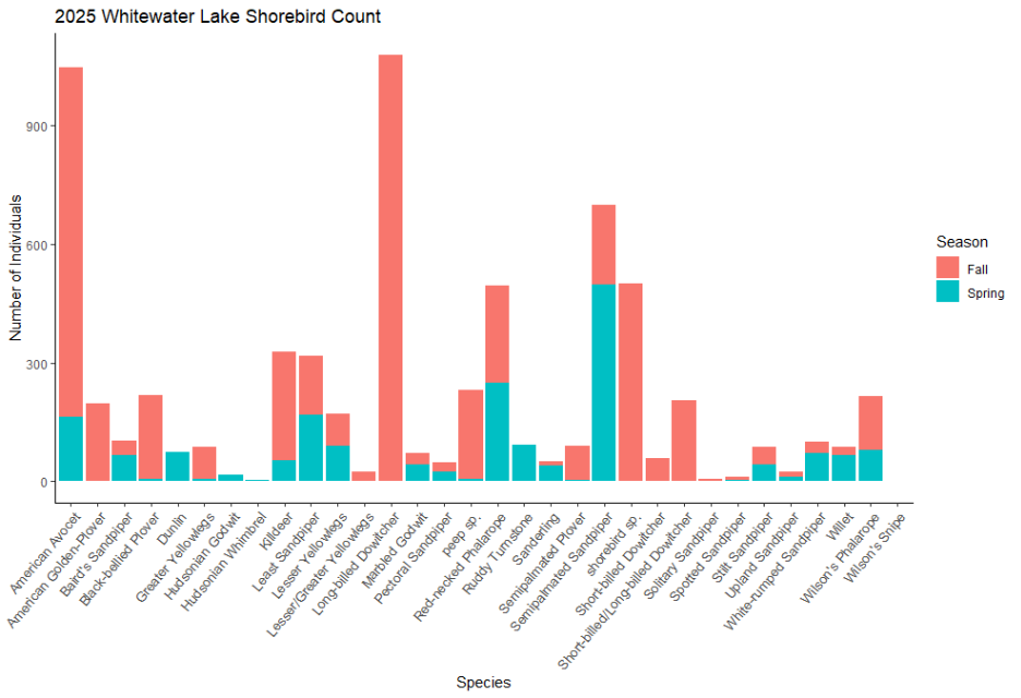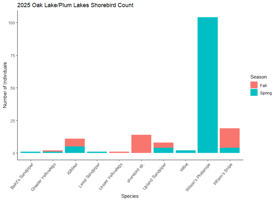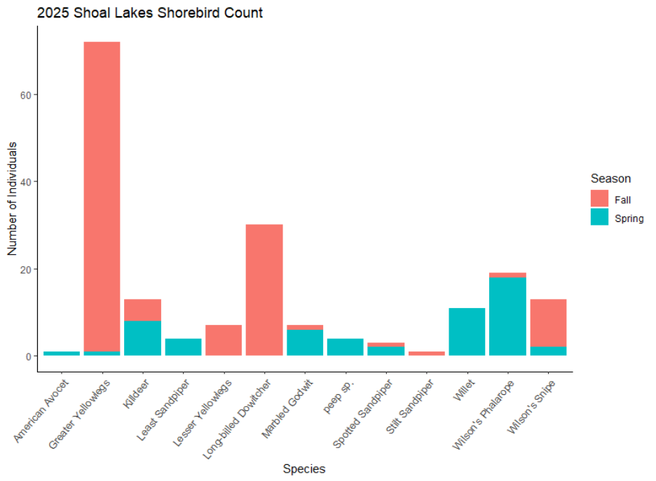 The final count of the 2025 Shoal Lakes Red-headed Woodpecker Blitz came to 40 RHWO, as I said above, a new potential program record! In total, our excellent group of birders observed 1753 individuals of 102 different species. A table summarizing all the observations is included below. Thank you again to our volunteers for an incredible event! This event was made possible by funding from Environment and Climate Change Canada’s Habitat Stewardship Fund.