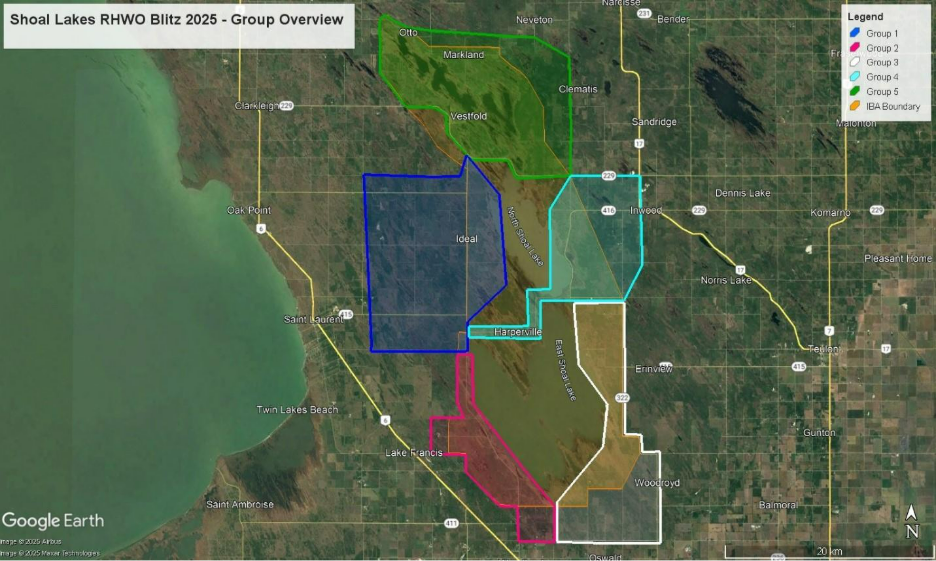 Bonnie and Gwyn were in Group 4, and they travelled south on Highway 416 along the east shore of North Shoal Lake, then surveyed between North and East Shoal Lakes on Highway 415. They spotted 3 RHWO during their survey, as well as a total of 29 Great Egrets!