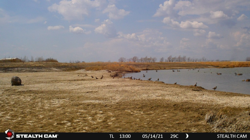 Trail camera image of (mainly) American Golden Plovers and Canada Geese using the scrape and adjacent pond. Photo by: Manitoba IBA Program.